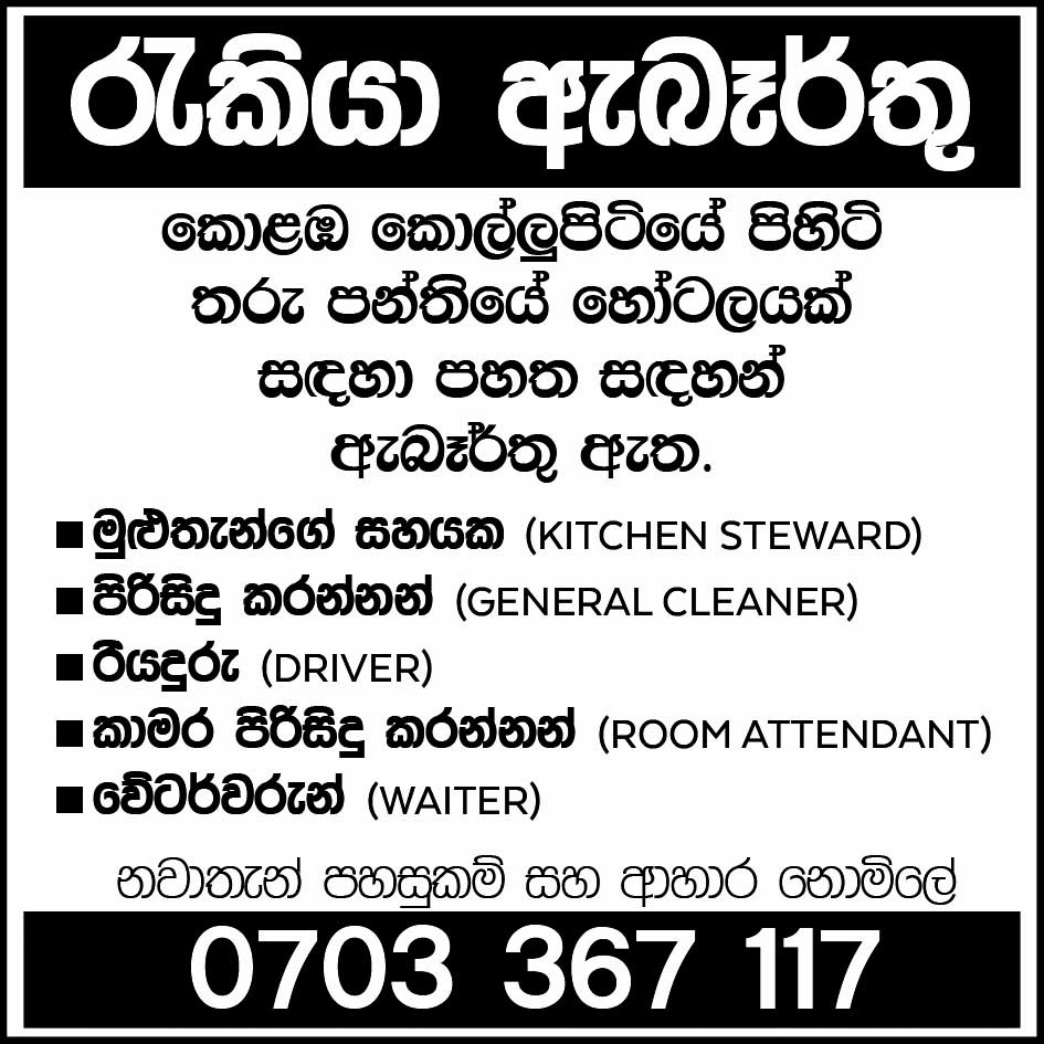 Kitchen Steward, General Cleaner, Driver, Room Attendant, Waiter