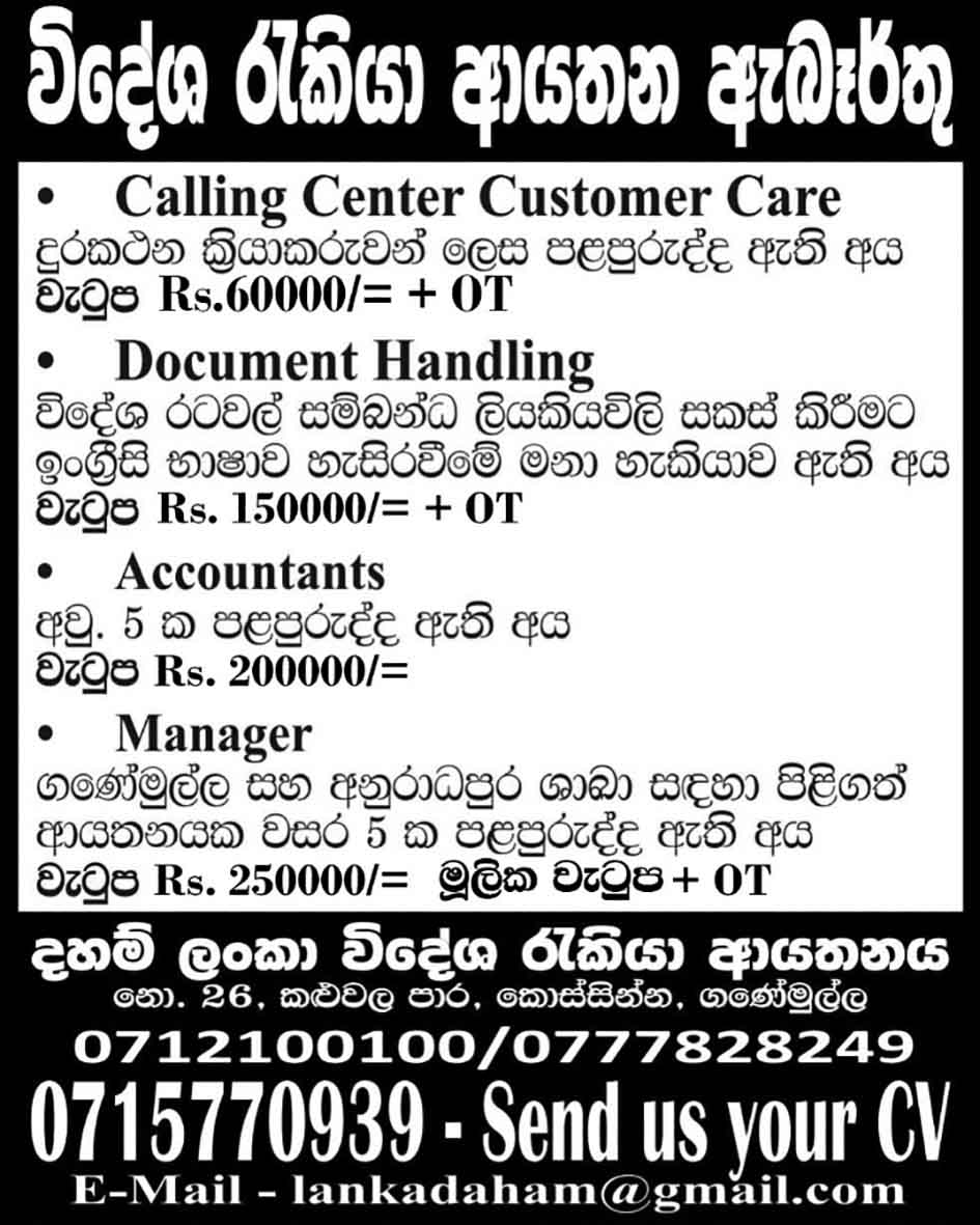 Calling Center Customer Care, Document Handling, Accountants, Manager