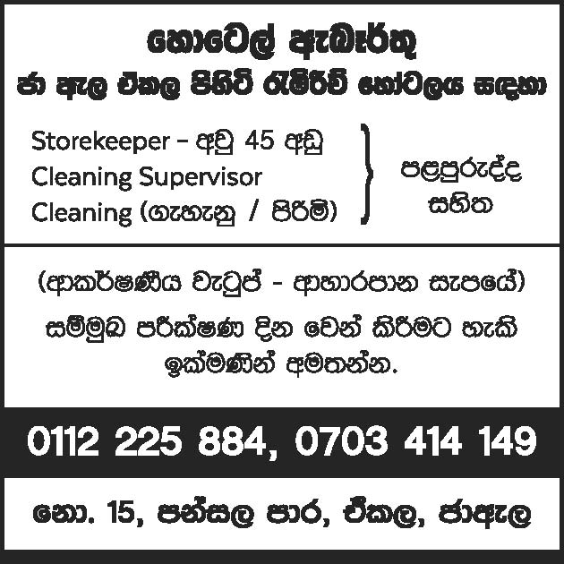 Storekeeper, Cleaning Supervisor, Cleaning - Male/Female