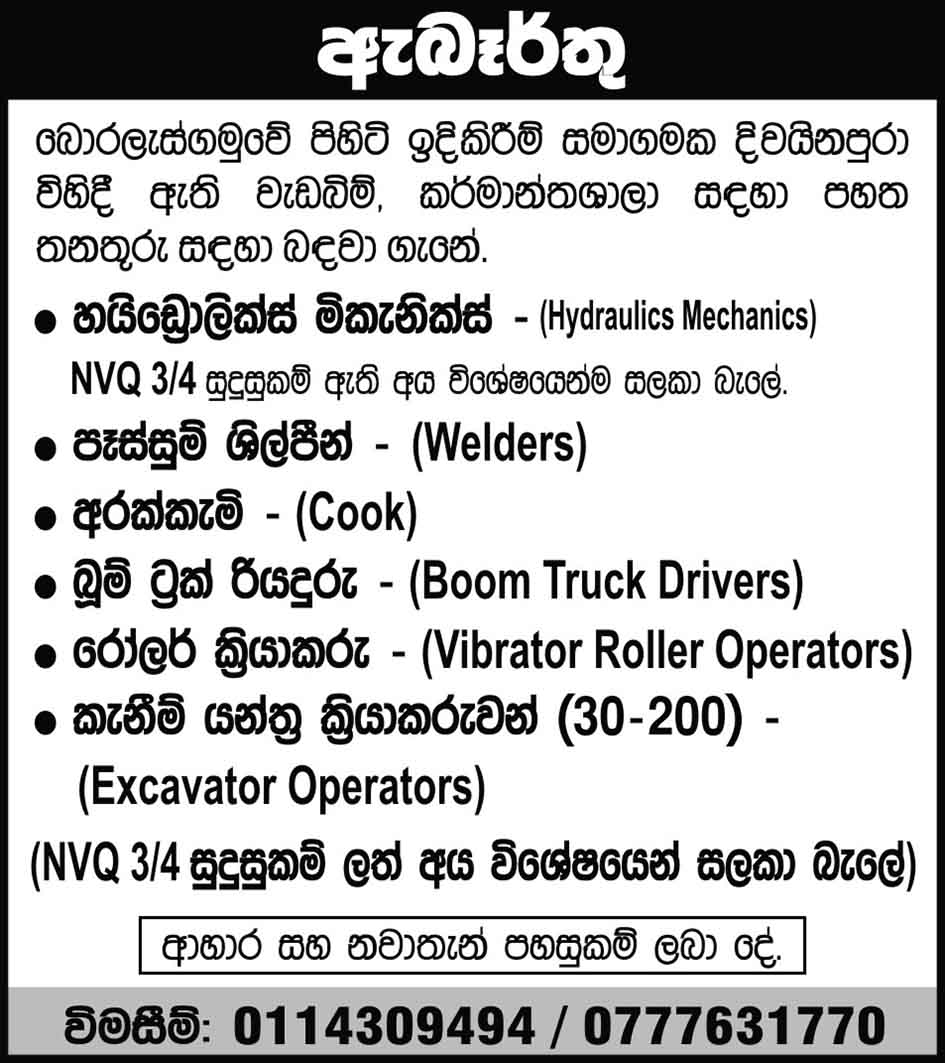 Hydraulics Mechanics, Welders, Cook, Boom Truck Drivers, Excavator Operators