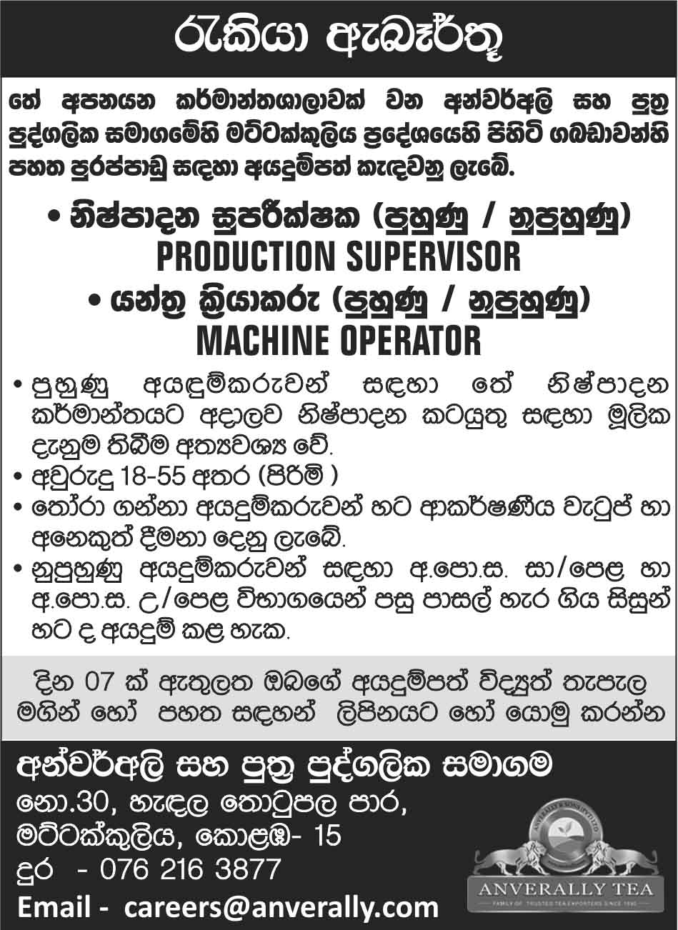 Production Supervisor, Machine Opertor