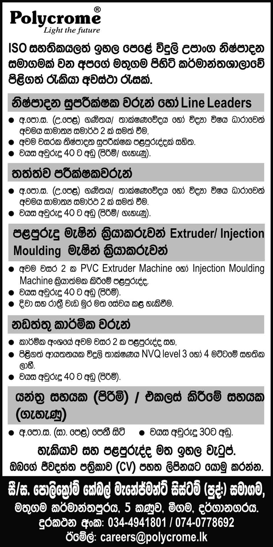 Line Leaders, Quality Controler, Extruder/Injection Moulding Machine Operator