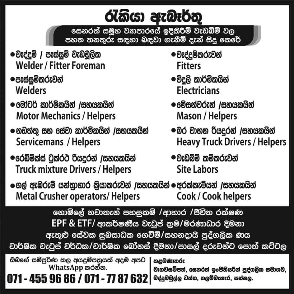 Welder, Fitter Foreman, Motor Mechanics, Helpers, Servicemans, Electricians, Fitters