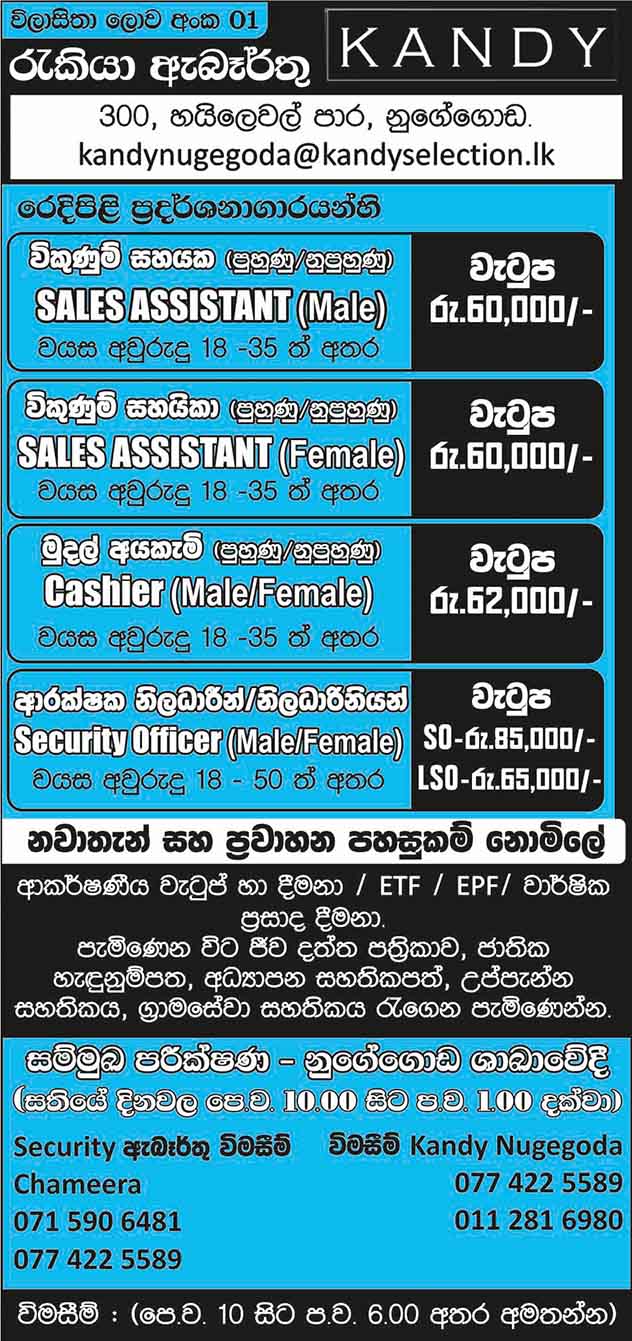 Sales Assistant Male & Female, Securiy Officer, Cashier Male & Female