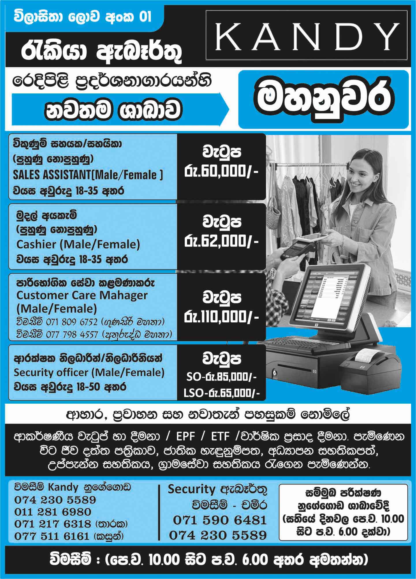 Sales Assistant, Security Officer, Cashier Male & Female, Customer Care Manager