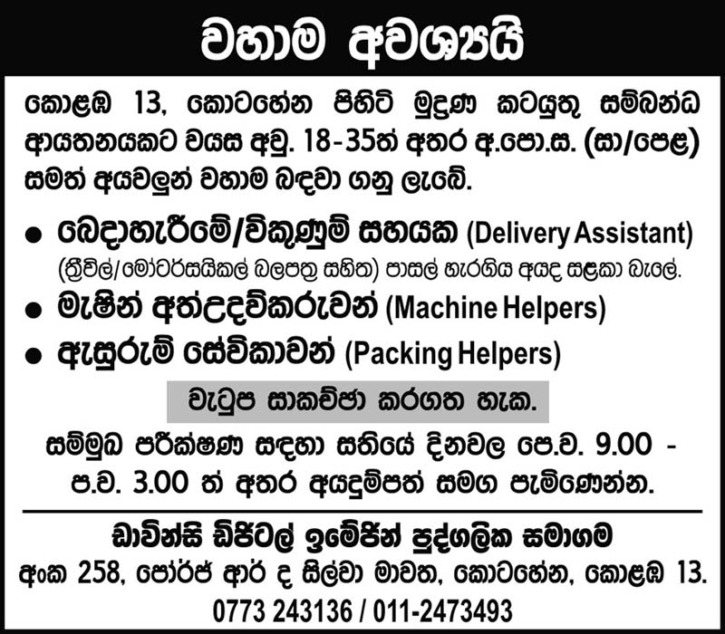 Delivery Assistant, Machine Helpers, Packing Helpers
