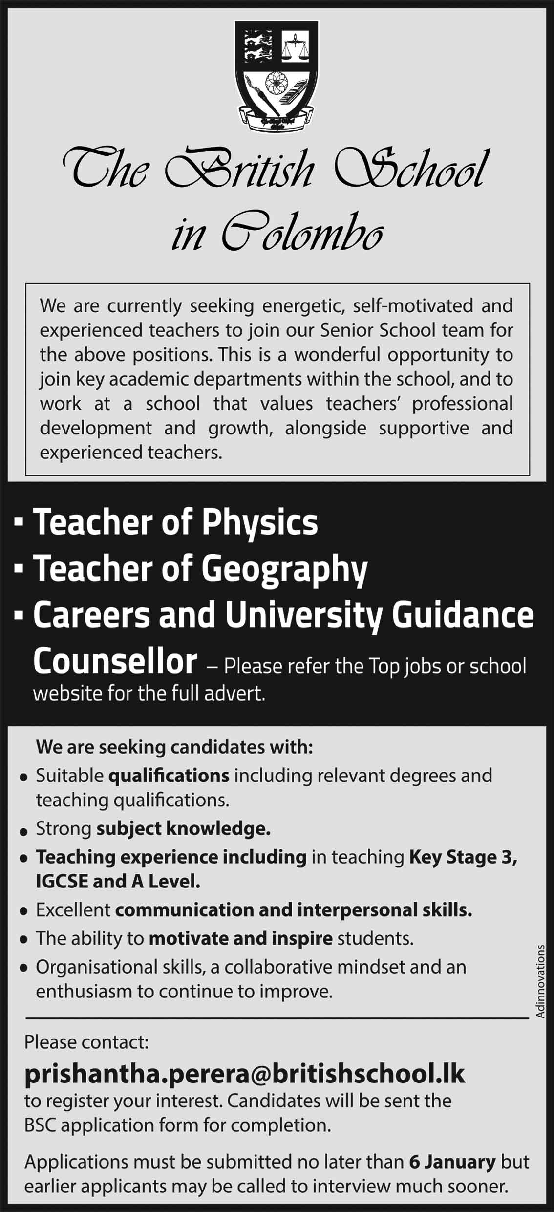 Teacher of Physics, Teacher of Geography, Counsellor